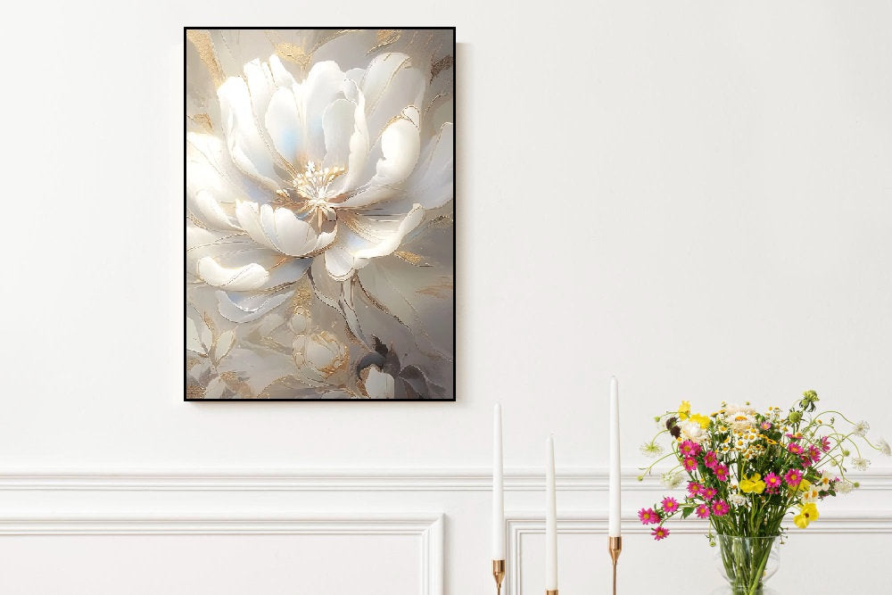 Großes Blumen-Wandbild, großer floraler Leinwanddruck, weißes Wildblumen-Kunstwerk, Ölgemälde-Wandbild im schwebenden Rahmen, botanisches Schlafzimmer-Kunstwerk