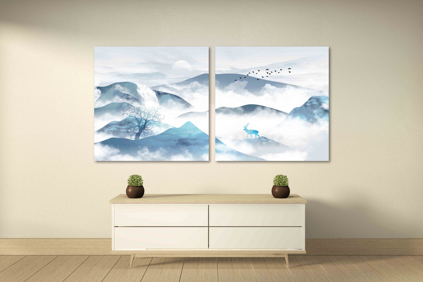 •Die Größe eines Gemäldesets, das aus mehreren Tafeln besteht, wird berechnet, indem die Tafeln zusammengezählt werden. Es wird empfohlen, solche Sets mit einem Abstand von 1–2 Zoll zwischen den Tafeln an der Wand anzubringen. Je größer die Bildelemente, desto größer ist der zulässige Abstand zwischen ihnen.