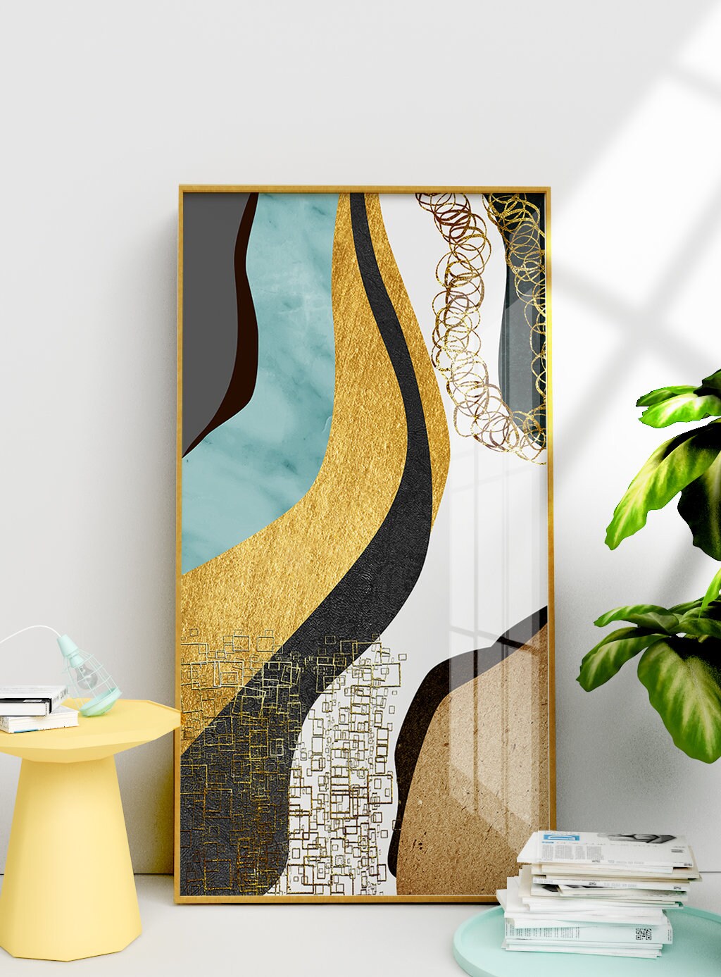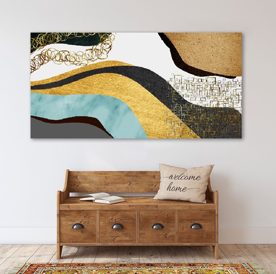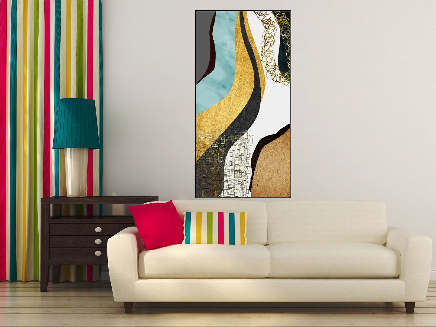 Großes abstraktes Wandbild im Floater-Rahmen, farbenfrohes druckbares Kunstwerk, gerahmtes abstraktes Kunstwerk auf Leinwand mit goldenen Wellen, hängende Wandkunst fürs Wohnzimmer