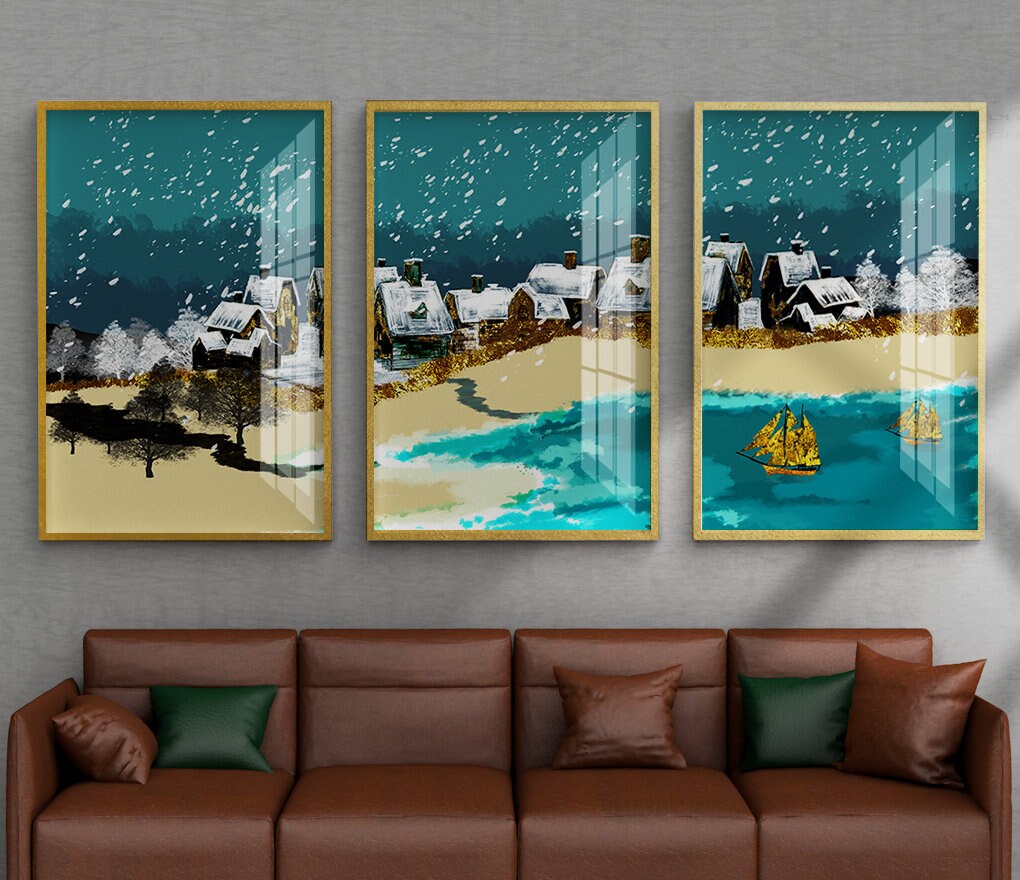Großes 3er-Set Leinwandbilder mit Bauernhäusern, großer blauer Leinwanddruck im schwebenden Rahmen, Winterdorf-Wanddekor im schwebenden Rahmen