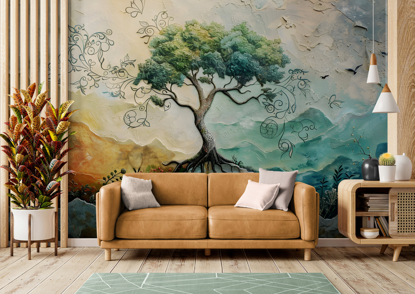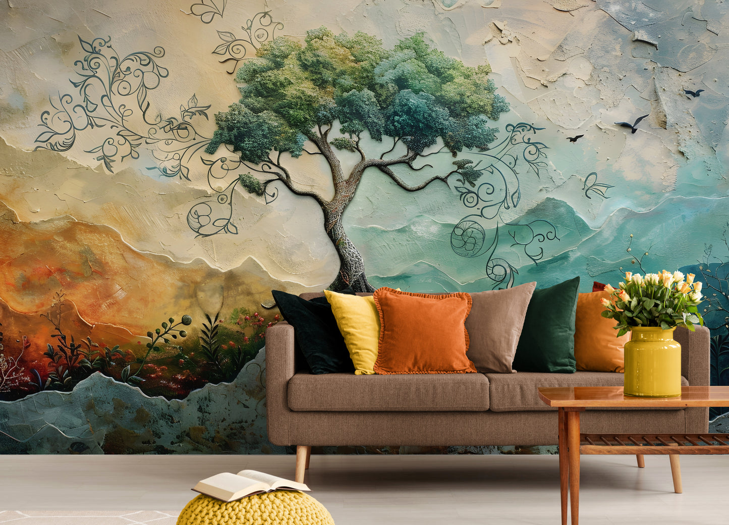 Lebensbaum-Tapete, botanisches Wandbild zum Abziehen und Aufkleben, selbstklebende Tapete mit großem Baumbild, abnehmbares Wandbild, farbenfrohes Natur-Wandbild, Akzenttapete