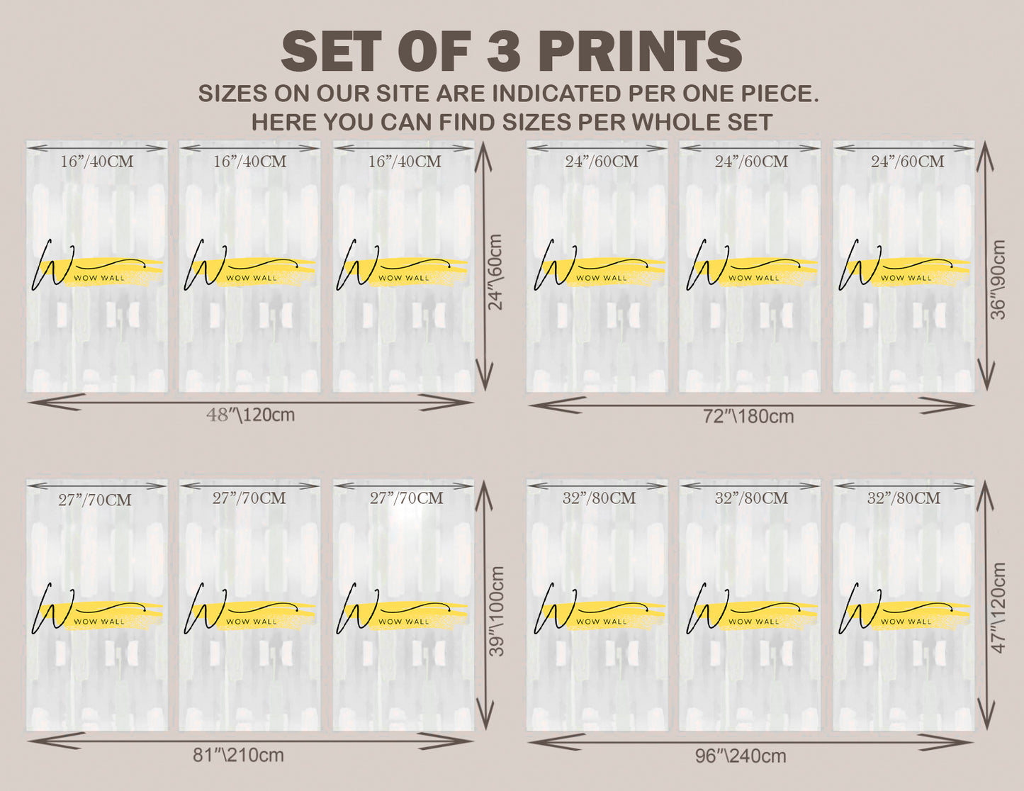 • Die Größe eines Gemäldesets, das aus mehreren Tafeln besteht, wird berechnet, indem die Tafeln zusammengezählt werden. Es wird empfohlen, solche Sets mit einem Abstand von 1–2 Zoll zwischen den Tafeln an der Wand anzubringen. Je größer die Bildelemente sind, desto größer ist der zulässige Abstand zwischen ihnen.
