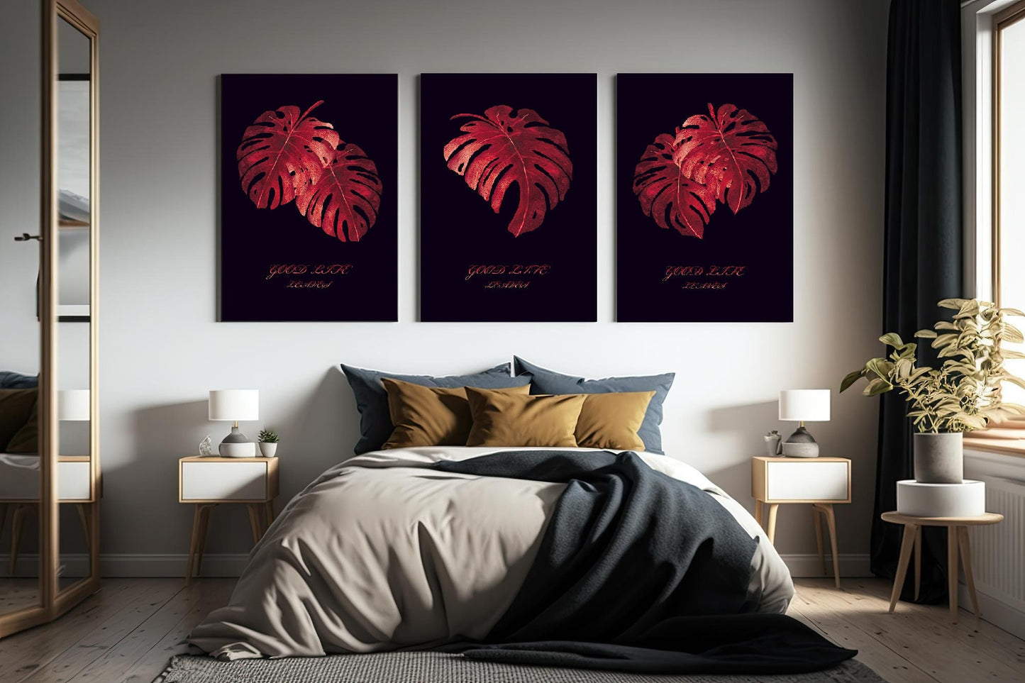 3er-Set Natur-Leinwanddrucke, Wandkunst mit schwebendem Rahmen und roten Blättern, extra großes botanisches Wanddekor, trendiges dreiteiliges Kunstwerk
