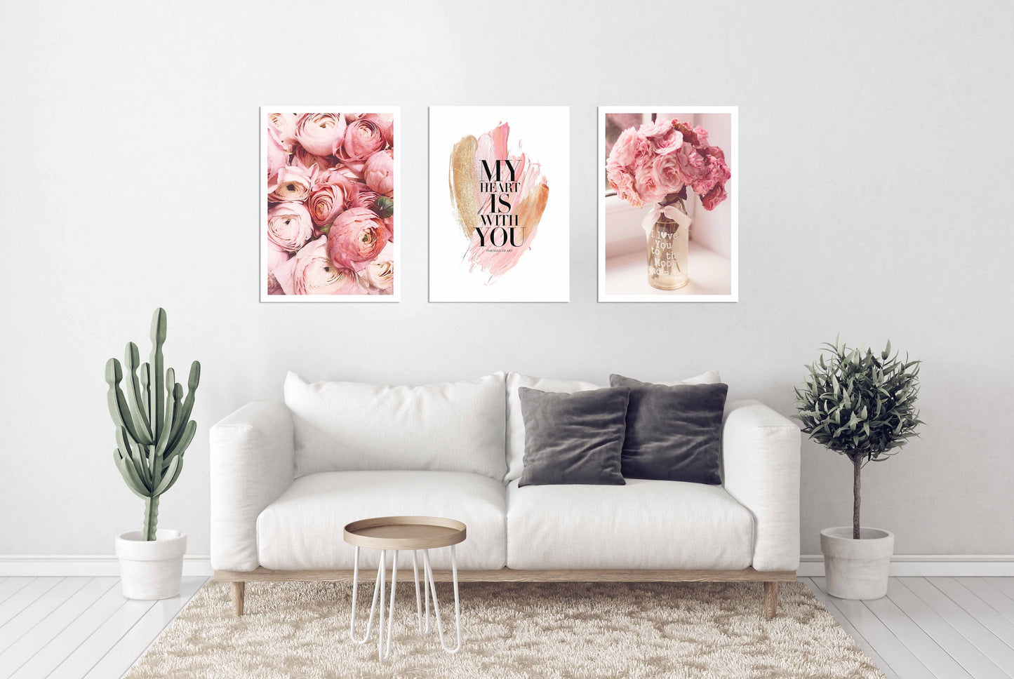 Dreier-Set mit floralen Wandkunstdrucken im schwebenden Rahmen, modernes gerahmtes Blumenkunstwerk, Leinwanddruck mit Bink-Blumen, inspirierende Wandkunst