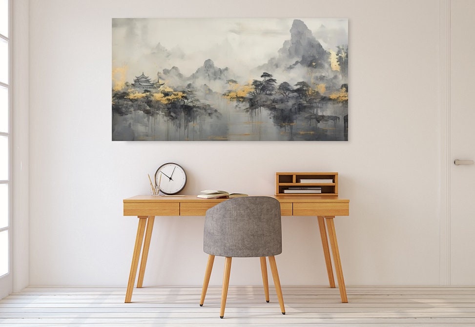Rauchige Berge Wandkunst, schwebendes Landschaftsbild, nebliger Baum Leinwanddruck, japanische Wandkunst zum Aufhängen, großes graues Kunstwerk